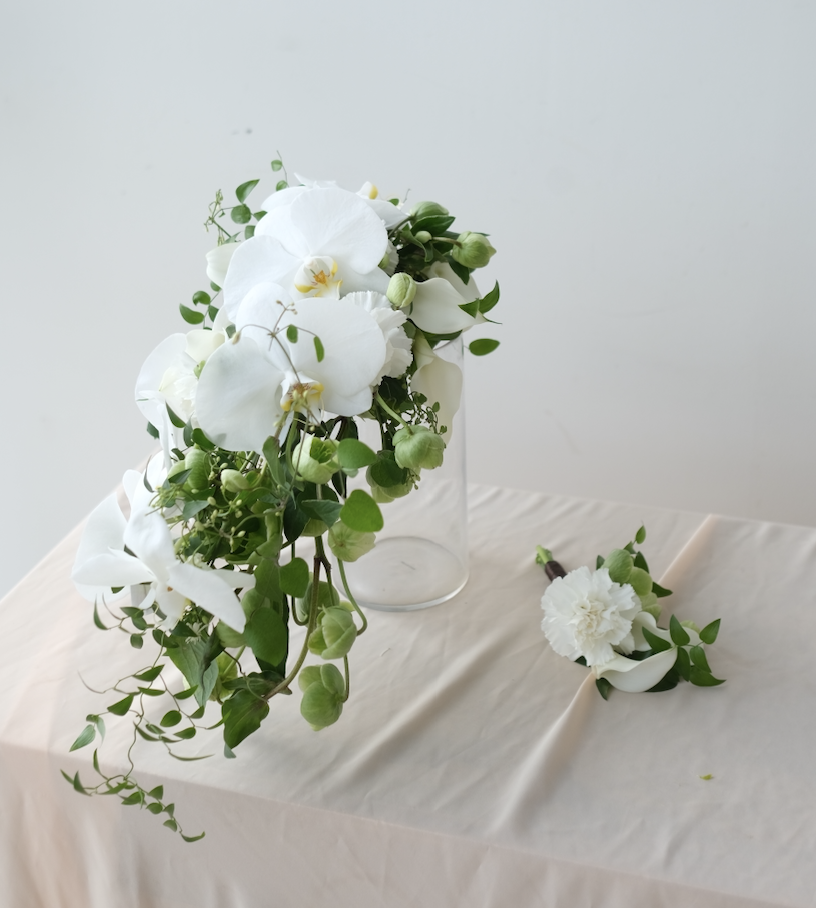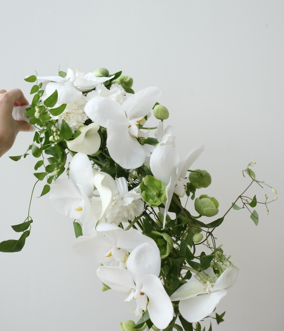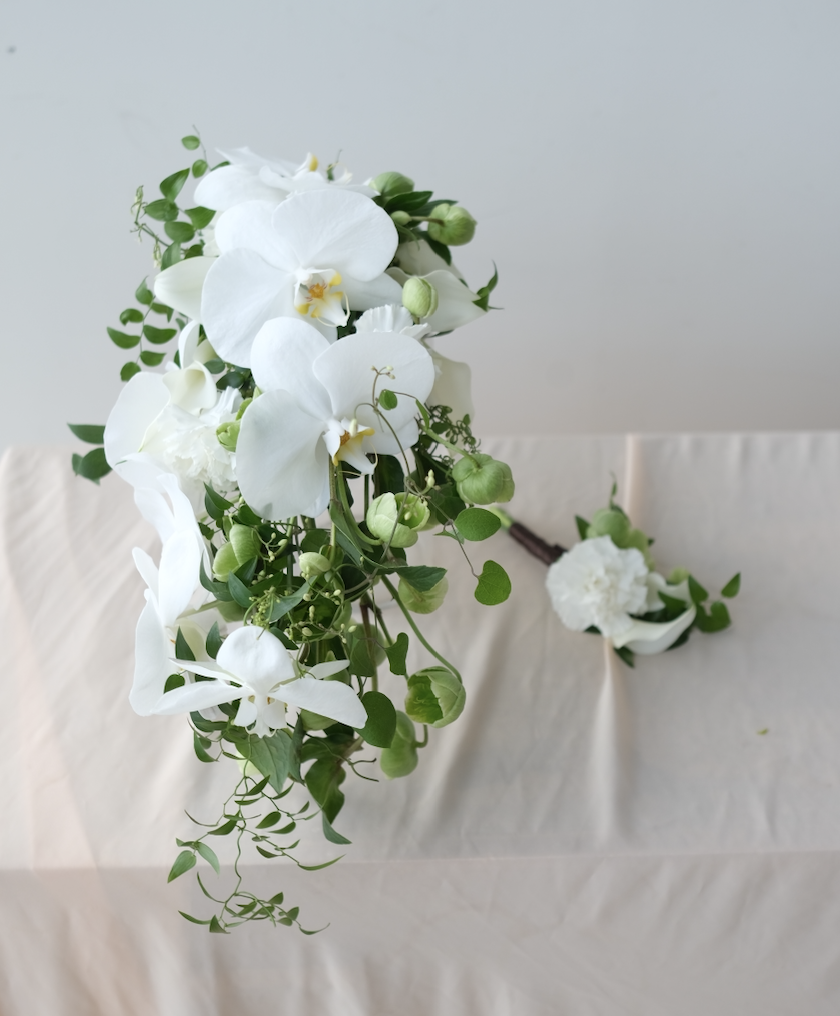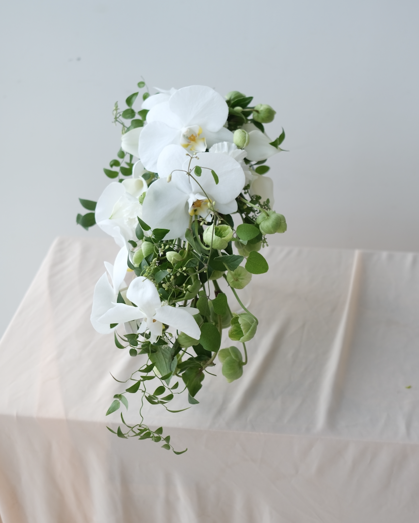 라인감을 한껏 살려준 그린&화이트 드롭 부케입니다.