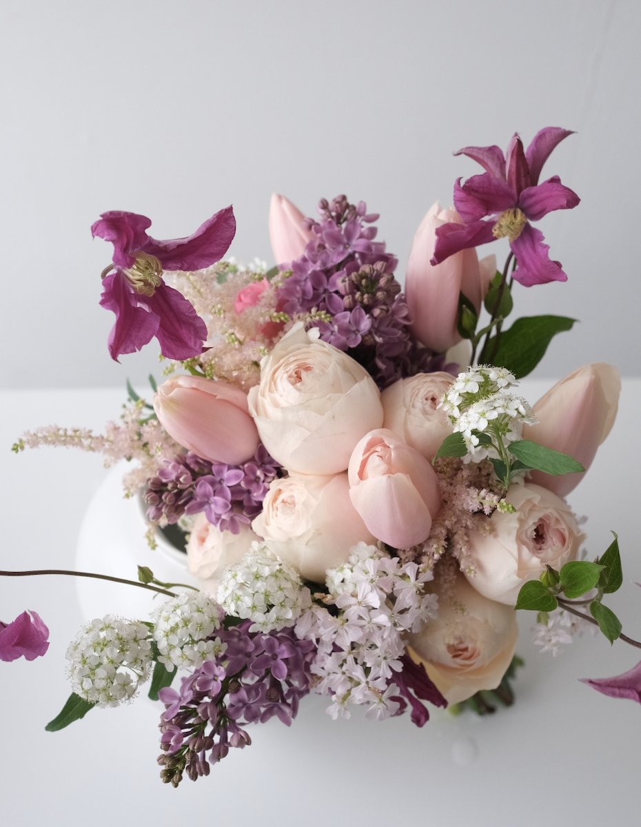 러블리한 핑크 튤립에 와인빛 클레마티스가 포인트로 들어간 블링 부케입니다.