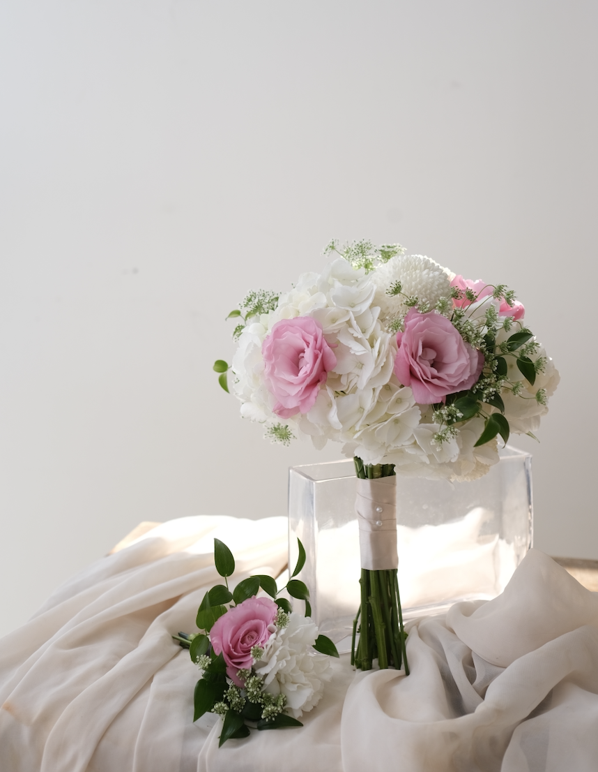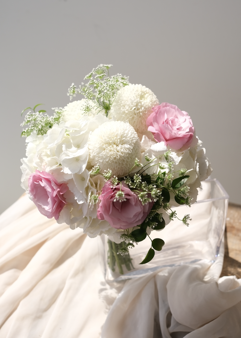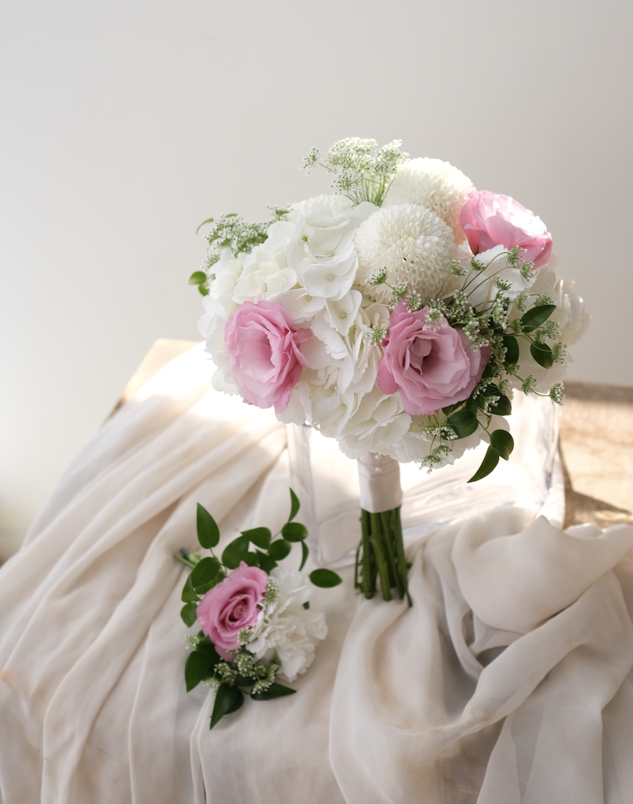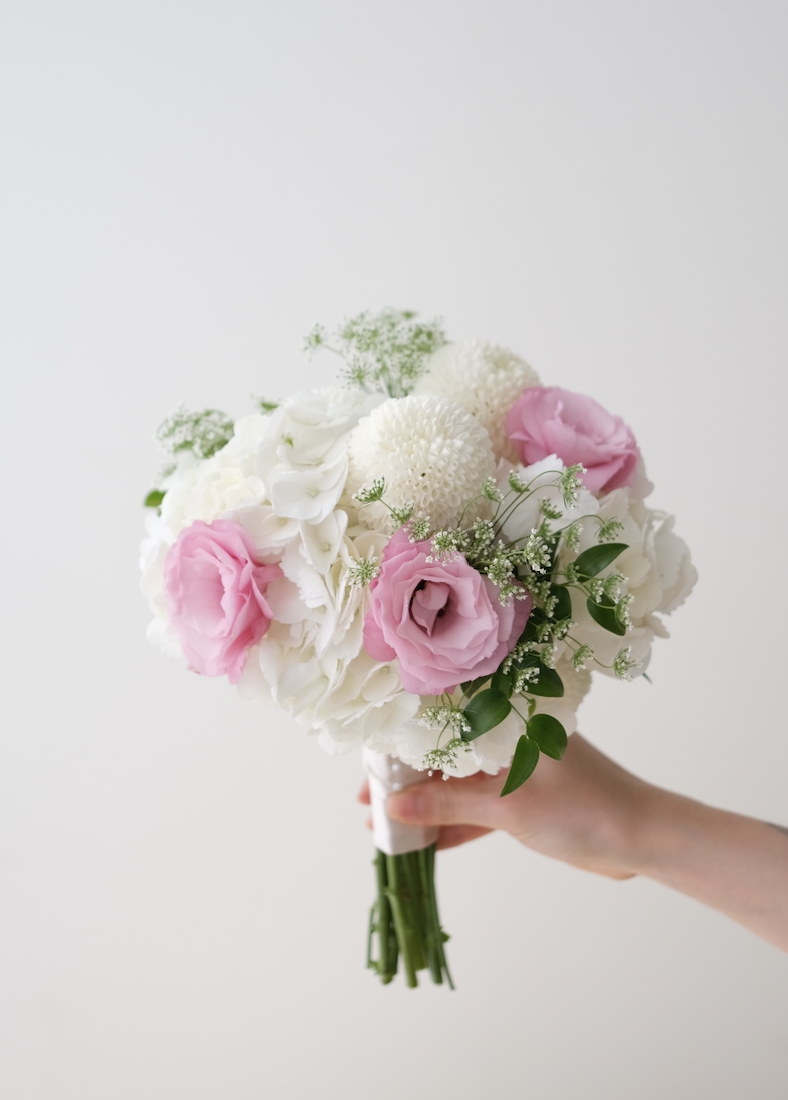화이트 수국에 핑크 리시안이 포인트로 들어간 몽마르 부케입니다.