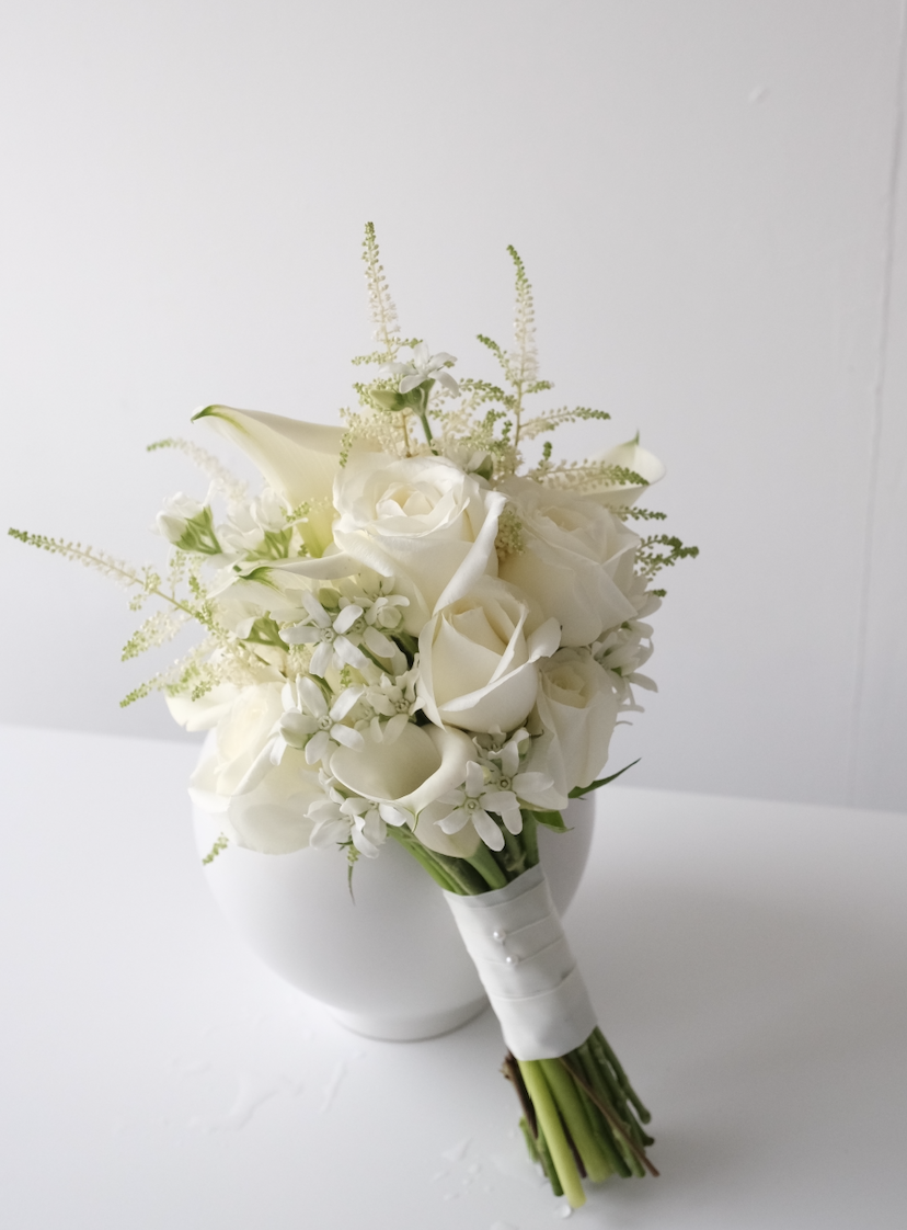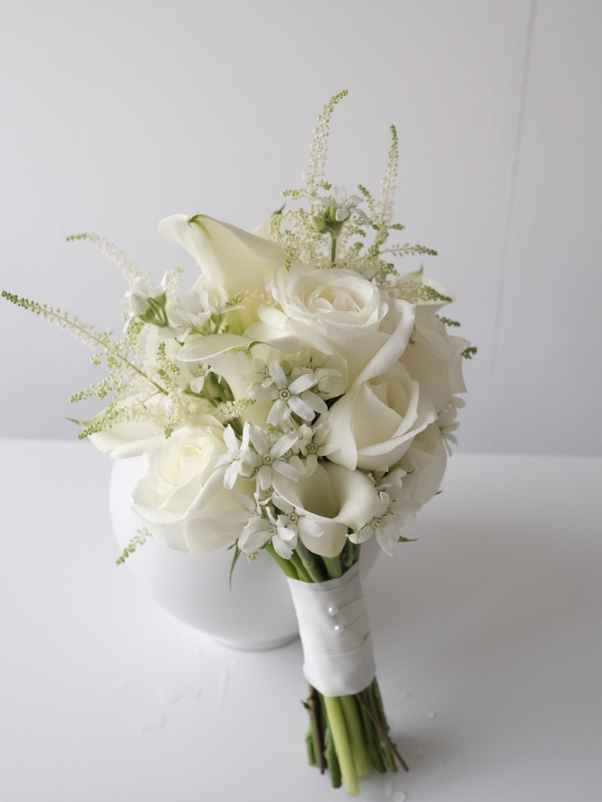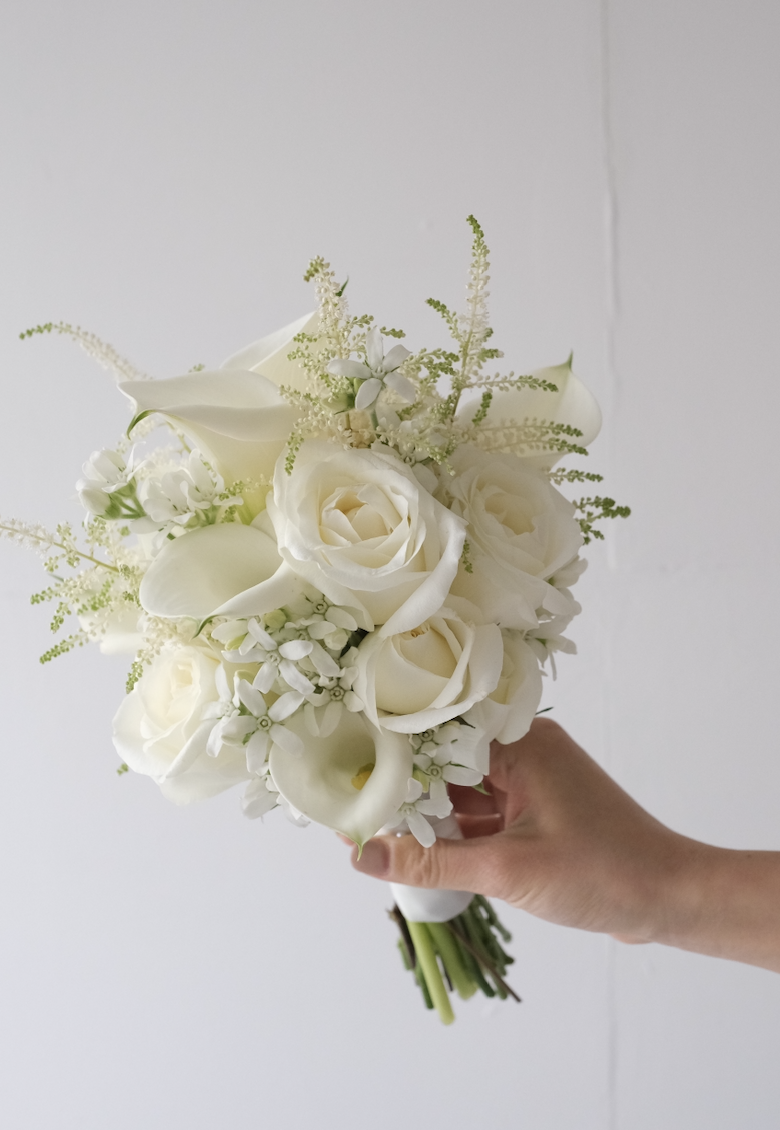 본식 부케의 정석이라 할 수 있는 카라와 화이트 장미 믹스부케 입니다.