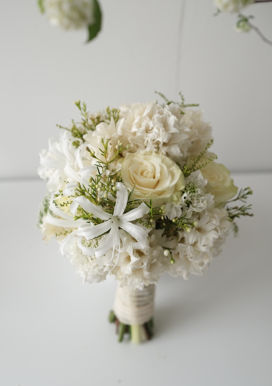 겨울꽃 내리네와 향긋한 히야신스, 대표적인 수입장미 몬디알 장미가 믹스된 부케입니다.