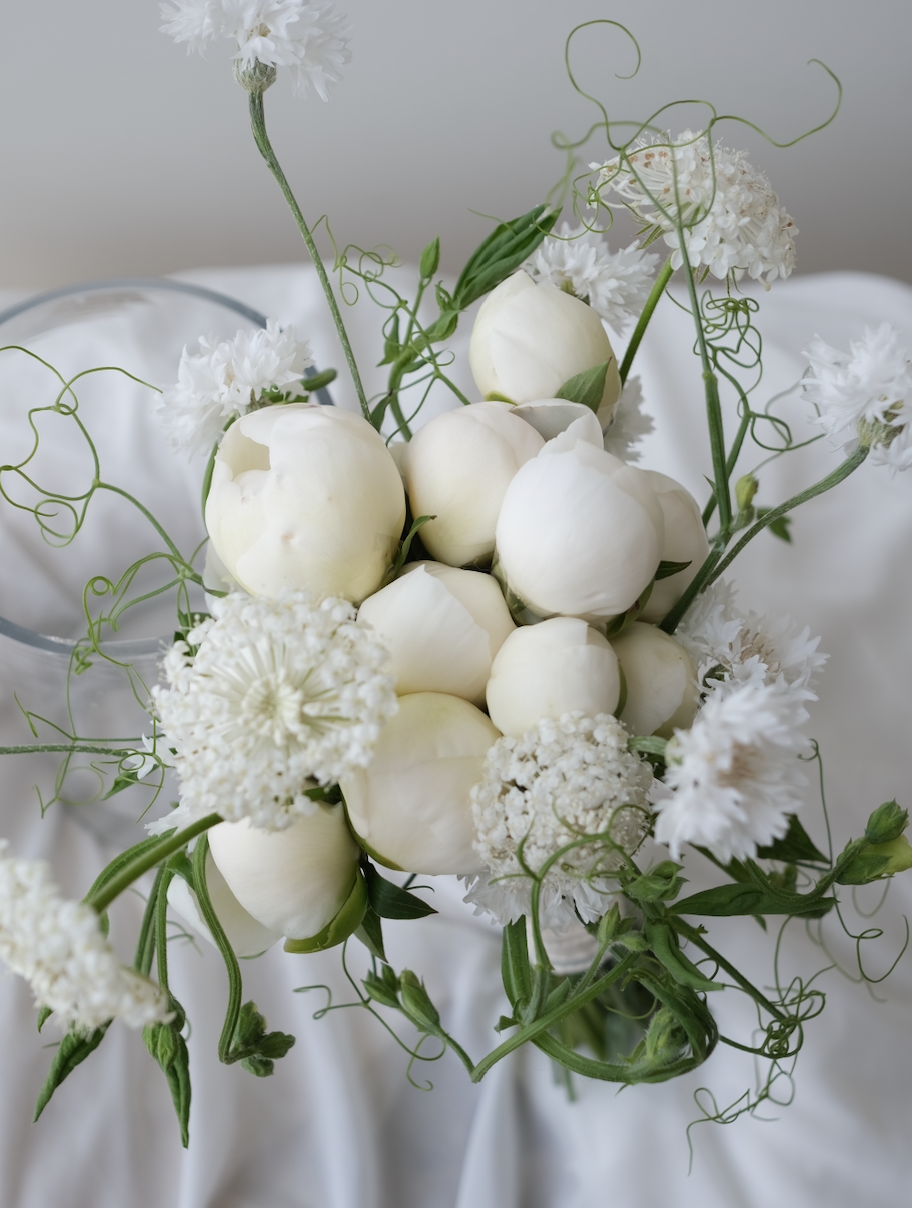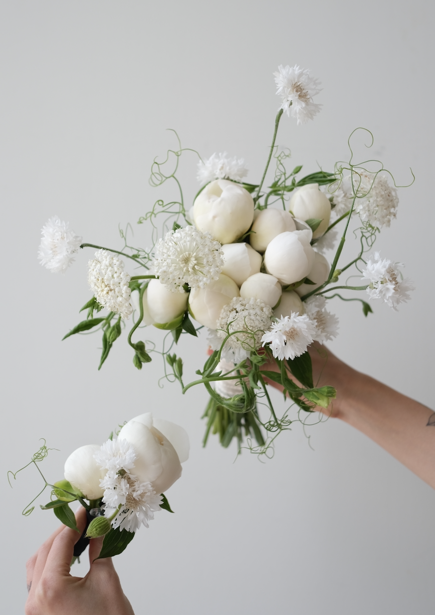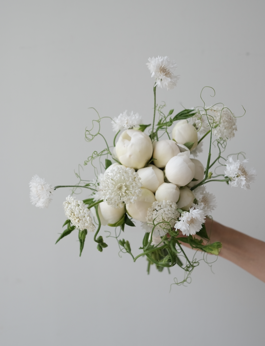일반적으로 동그란 쉐입의 작약 부케와 달리